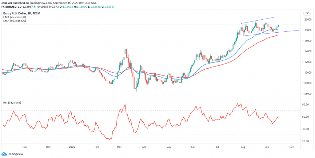 The EURUSD pair is trading at 1.1895. On the daily chart, we see that the pair started to rebound after reaching a low of 1.1743. This was an important price because it was along the lower line of the blue ascending channel. The price is also above the 25-day and 50-day exponential moving averages while the RSI has started moving upwards.