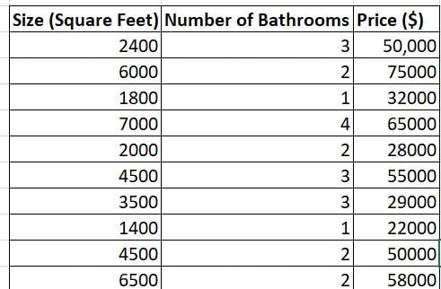 First things first-in linear regression, we plot the dependent variables are on the Y-axis and the independent variables on the X-axis. On the table below, we look at the variation of number of bathrooms, house sizes and the prices. Here, the house size and the number of bathrooms were the independent variables, while the prices were the dependent variable. On this occasion, we plotted the house sizes against the prices. Once the the line of best-fit falls into place, the model can utilise the features to forecast the price of new homes.