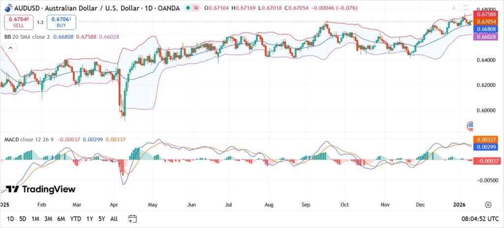 Momentum indicators remain constructive. The MACD is holding in positive territory, though flattening slightly, suggesting that while upside momentum has slowed, there is no clear bearish signal at this stage. A sustained break above 0.6760 would strengthen the bullish case, while a close below 0.6680 could expose a deeper pullback.