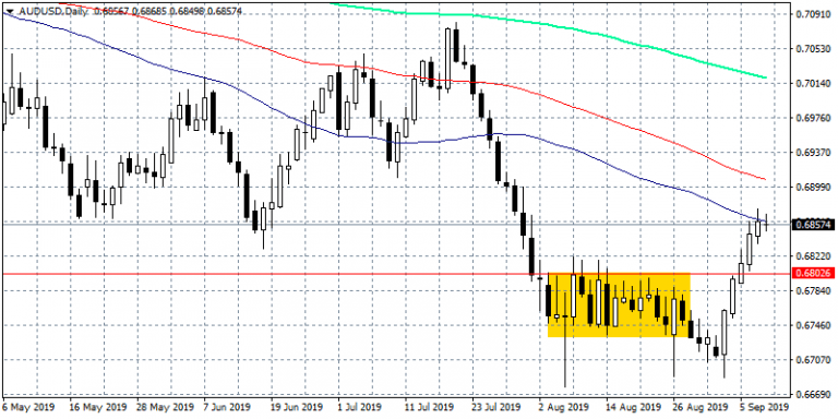 AUDUSD consolidates around 2-month highs, giving up 0.05% lower today at 0.6858 after National Australia Bank’s Business Confidence came in at 1 in August from previous 4.