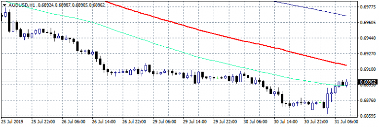 AUDUSD trades 0.32 percent higher at 0.6892 after Australia Consumer Price Index (year over year) came in at 1.6% above expectations of 1.5% in 2Q, the Consumer Price Index (QoQ) came in at 0.6% also above forecasts of 0.5% in 2Q. The Australia Private Sector Credit (YoY) declined to 3.3% in June from previous 3.6%. The previous week Governor Lowe of Reserve Bank of Australia in a speech said that it’s reasonable’ to expect lower rates for longer time and RBA is prepared to ease policy further if needed. FOMC policy decision later today, at which it is expected Fed to cut interest rates by 25 basis points will drive the pair for the rest of the week.
