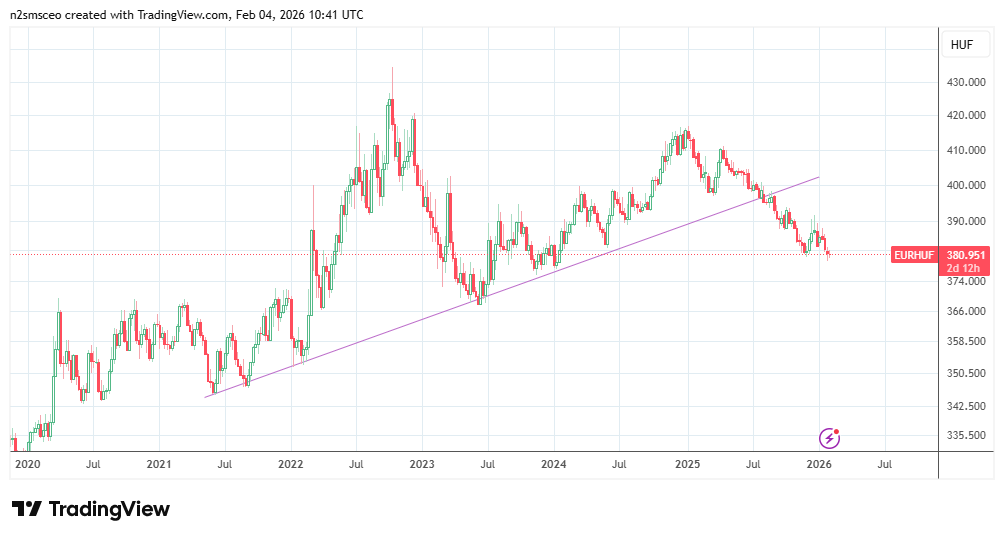 ING’s January 2026 FX table indicates a 3-month target of 385, a 6-month target of 390, and a full-year target of 385. In other words, the EUR/HUF is expected to trade around 385 with occasional spikes at the mentioned periods within the year.