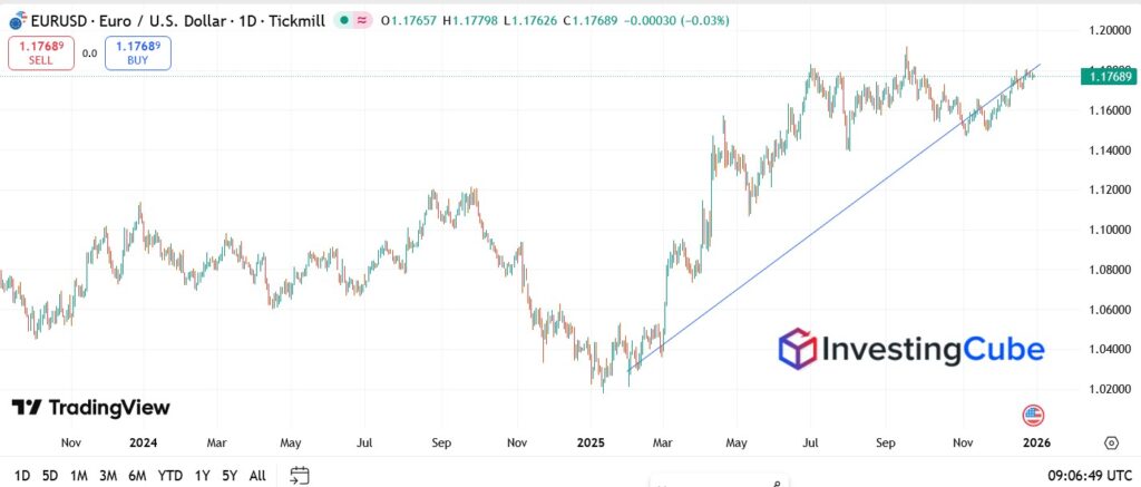 At its December meeting, the ECB revised its GDP growth forecasts higher, a move that analysts said reinforced confidence in the single currency. Trading Economics data also showed inflation stabilising across key Eurozone economies, reducing pressure for further aggressive easing.