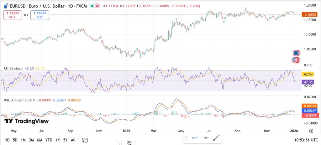 - EUR/USD slides below 1.1700 as rate expectations and bearish momentum weigh, with RSI and MACD pointing to further downside pressure.