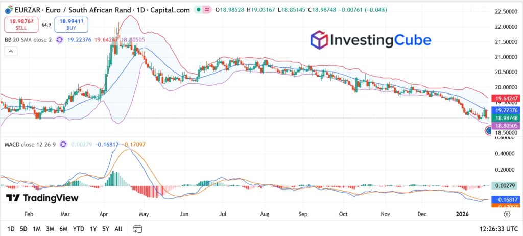 - Price action: EUR/ZAR is trading below the 20-day Bollinger midline near 19.22, which keeps the near-term bias tilted lower.