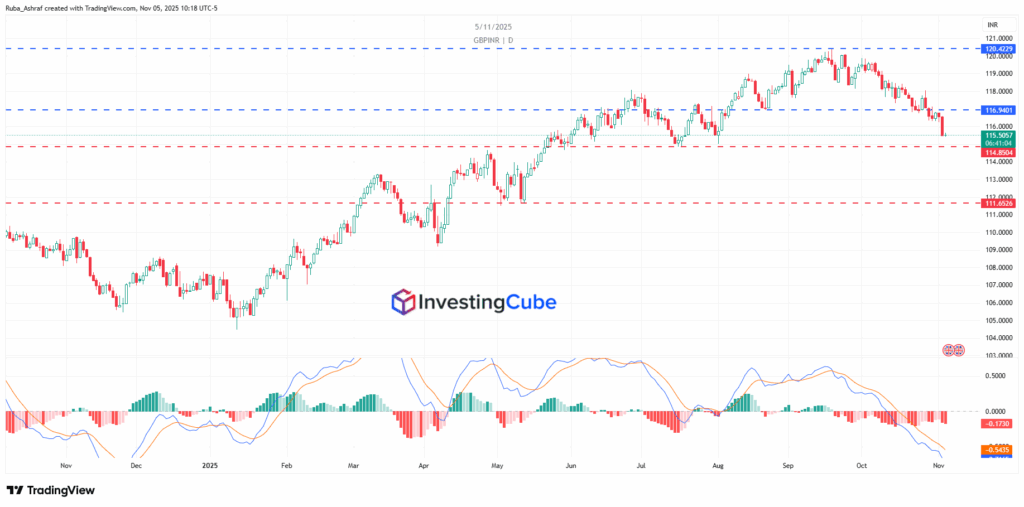 - GBP/INR remains under pressure below the key resistance level of 116.94, showing limited upside momentum.