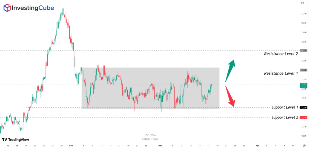 - GBP/INR may trade in 122 – 124 range.