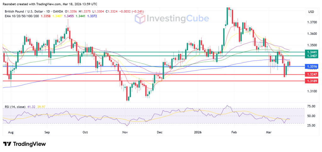 GBP/USD daily chart with key levels of resistance and support on the daily chart on March 18, 2026. Created on TradingView