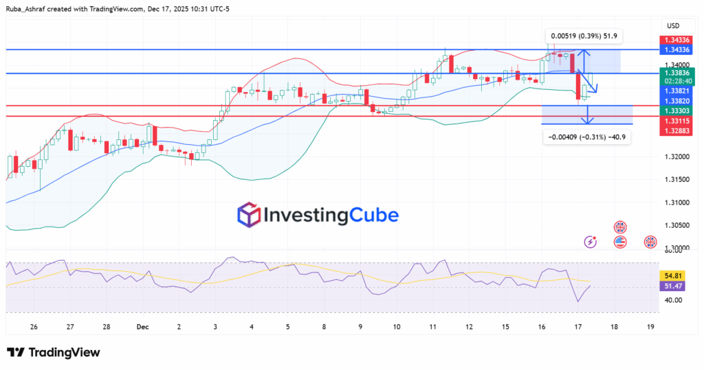 The price action shows that the GBP/USD is trading within a well-defined range after failing to sustain gains above recent highs. On the upside, the pair faces strong resistance around 1.3380-1.3430. This zone aligns with the upper Bollinger band.