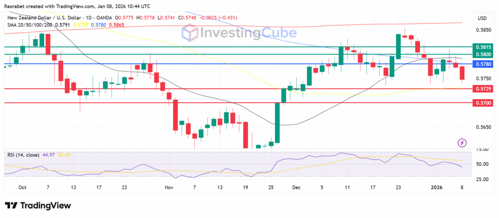 After a brief rebound earlier in the new year, the New Zealand dollar is again falling against the US dollar, staying within a downward channel since late December 2025. The NZD/USD pair, often called the Kiwi, hasn’t been able to break out and is around 0.5767 as of January 8, 2026.