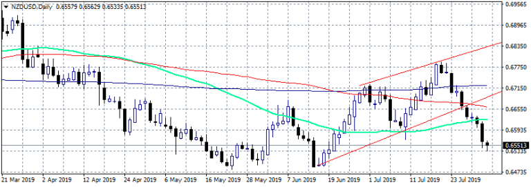 NZDUSD gives up 0.12 percent at 0.6553 at three week lows amid USD strength across the board. Yesterday the New Zealand ANZ Business Confidence came in at -44.3 below expectations of-34.9 in July; ANZ Activity Outlook registered at 5%, below expectations of 8.3% in July. A report that the RBNZ is starting to explore more unconventional policy pushed also the kiwi lower. The China Caixin Manufacturing PMI came in at 49.9, topping expectations of 49.6 in July giving support to kiwi.