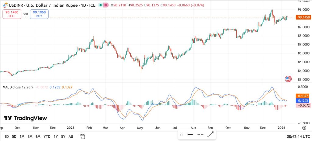 From a technical standpoint, USD/INR remains in a broader uptrend on the daily chart. The pair continues to trade above key medium-term support levels, reflecting underlying demand for the dollar.