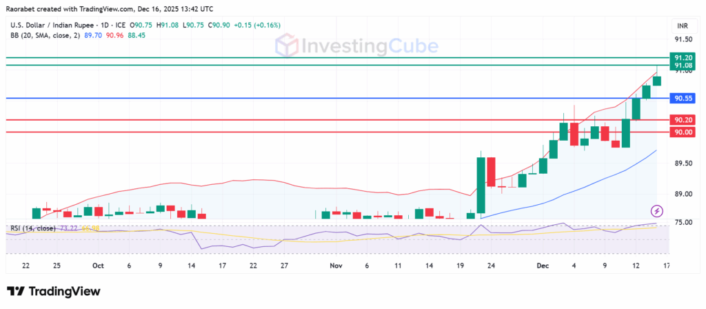 The USD/INR Relative Strength Index (RSI) is currently at 73, indicating overbought conditions that could usher a consolidation zone. The immediate resistance level is clustered around the historical high of 91.08-91.20. Conversely, the first support level to watch is the 90.20 mark, with the second one likely to come lower at the psychological 90.00.
