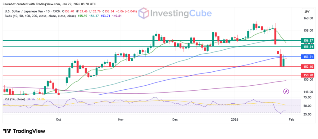 USD/JPY is showing bearish momentum, trading below key SMAs like the 10-day at 155.97 and 50-day at 156.37. The RSI at 34.96 is near oversold conditions but strengthening bears. Immediate support is currently sitting at 152.10, with the second one at 150.70, aligning with year-to-date lows. An extended bearish control could open the path to the psychological floor at 150.00. Looking at recovery, if the pair manages to go above the 153.71 pivot (100-day SMA), it will likely face strong resistance at 154.34, followed by the 50-day SMA at 156.37.
