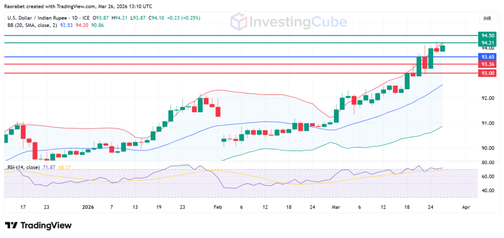 USD/INR RSI on the daily chart stands at 71.87, signaling that the bullish conditions are reaching extreme overbought territory. The first resistance appears at 94.21, just outside the upper Bollinger Band on the daily chart. A break past that could send the pair higher to test 94.50. Going below 93.65 pivot will shift the momentum to the downside, with immediate support at 93.36, and a stronger backing at 93.00.