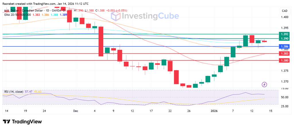 USD/CAD daily chart with key support and resistance levels on 14 January, 2026. Created on TradingView