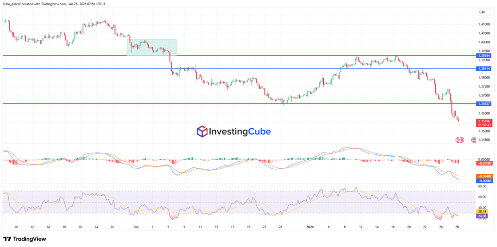 As long as the pair remains below these resistance zones 1.3850–1.3920, the downside bias is likely to persist. The MACD is deeply negative, confirming strong bearish momentum and limited signs of an immediate reversal.