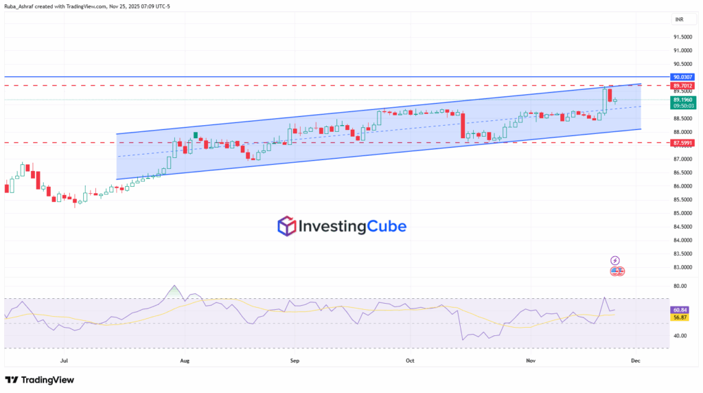 - USD/INR remains in a steady uptrend, holding firm inside its ascending channel despite resistance near 90.