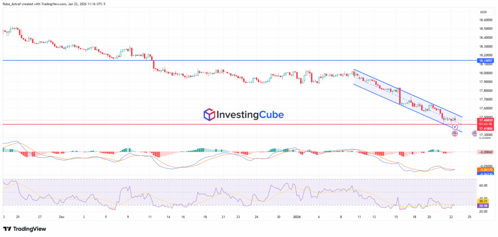USD/MXN is trading within a downward channel, showing continued bearish momentum as it approaches the support area around 17.41–17.46. The MACD remains below its signal line in negative territory, confirming the ongoing downtrend, while the histogram shows slight contraction, suggesting the selling momentum may be easing.