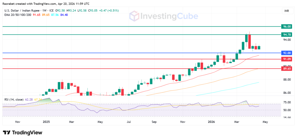 By mid-April 2026, the USDINR pair was observed trading near the 93.10 level, indicating a substantial depreciation from its 90.00 position at the close of 2025.