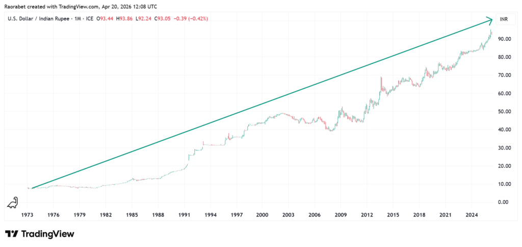 After retracing to 39.9 rupees in November 2007, the USD/INR has been on an uptrend since then. The pair surged to an all-time high of 95.23 in March 2026.