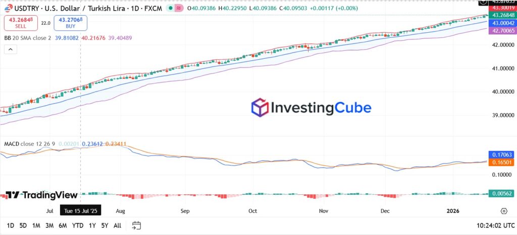 USD/TRY starts the new trading week holding firm above the 43.00 handle, with price action reflecting continued, orderly depreciation in the Turkish lira rather than disorderly volatility. The pair last traded near the 43.20–43.30 region, extending the gradual grind higher that has defined the trend since late 2025.