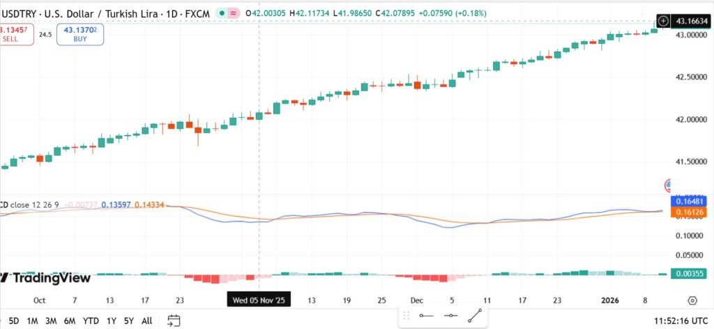 USD/TRY remains firmly supported near record highs as the Turkish lira continues to face sustained pressure. The pair is trading around the 43.10–43.15 region, extending the steady advance that has defined price action since late last week. Rather than showing signs of exhaustion, the move higher has been gradual and controlled, pointing to structural demand for the US dollar rather than short-term positioning.