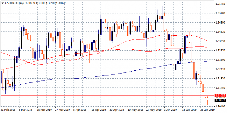 USDCAD gives up 0.12 percent to 1.3072 after stronger than expected figures from Canada. The GDP growth in April came in at 0.3% beating the analyst’s expectation of 0.1%, previous figure was at 0.5%. The Bank of Canada Business Outlook Survey for the 2Q 2019 noted a slight improvement in the Canadian business sentiment and investment and employment opportunities continue strong. Above that the United States Chicago Purchasing Managers’ Index came at 49.7 below markets expectations of 53.1 for June. The University of Michigan’s Consumer Confidence Index came in at 98.2 for June and beating analyst’s forecasts of 98. The mixed data from the U.S. economy failed to attract any bids in USD. USDCAD traders will closely follow the discussions in G20 meeting which started in Osaka for developments in China – USA trade war. Next week we have the important OPEC meeting which will drive oil prices and affect the Canadian dollar.