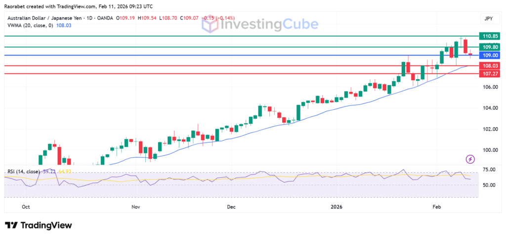 AUD/JPY daily chart on February 11,2026 with key support and resistance levels. Created on TradingView