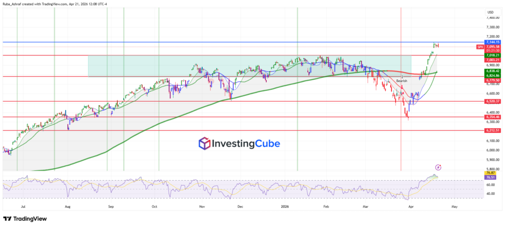 The S&P 500 is trading near the 7,100 level, signaling that US stocks are once again close to an all-time high this Tuesday. This rally is being driven by a sharp decline in energy prices, linked to growing optimism around progress in US-Iran peace talks.