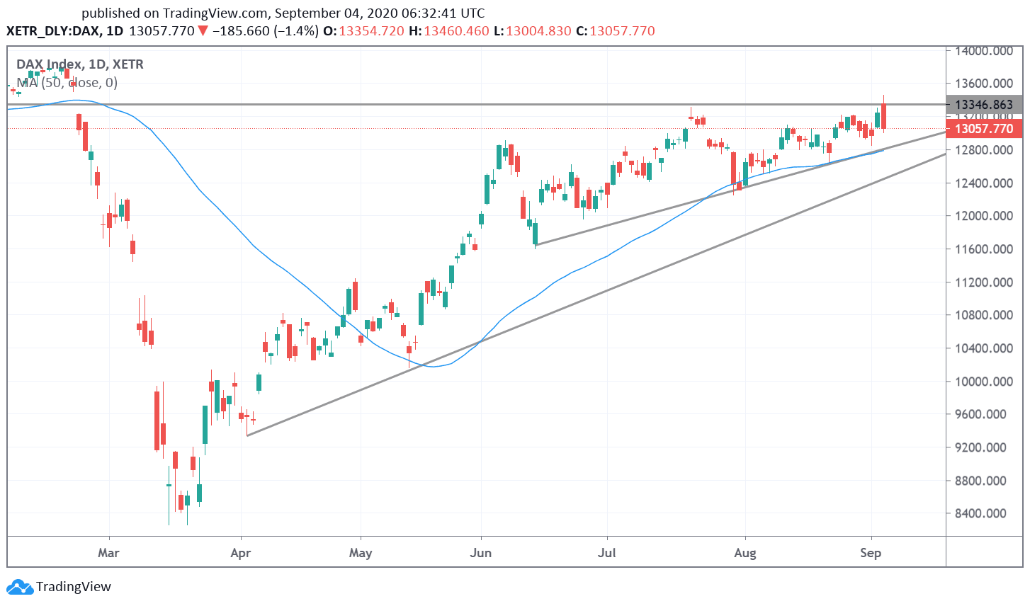 The DAX was 1.4% lower on Friday as European traders react to a big sell-off in U.S. markets. The Nasdaq fell 5% on Thursday, with the Dow off 800 points at the close. The Nasdaq has been driven higher by the large U.S. tech stocks and these were the leaders on the way down.