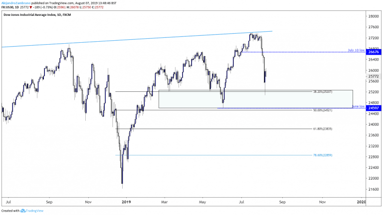 Following last week’s slide in the Dow Jones, the market has stabilized and has so far managed to claw back a bit more than 38.2% of the slide from its 2019 high. Looking beyond the global headlines of trade wars and rate cuts the technical trend of the Dow 30 remains upwards above the June low of 24597. As the trend remains upwards, it is not hard to understand why the market rose on Monday as the prices approached the June low. As for today’s trend, anyone’s guess is as good as mine. However, I can say that if the markets try to reach yesterday’s low of 25083, then bargain hunters could probably support the price for a test of the July 10 low at 26676. Around the July 10 low, the most bearish traders will probably try to short-sell with expectations that the price will challenge the June low once again.