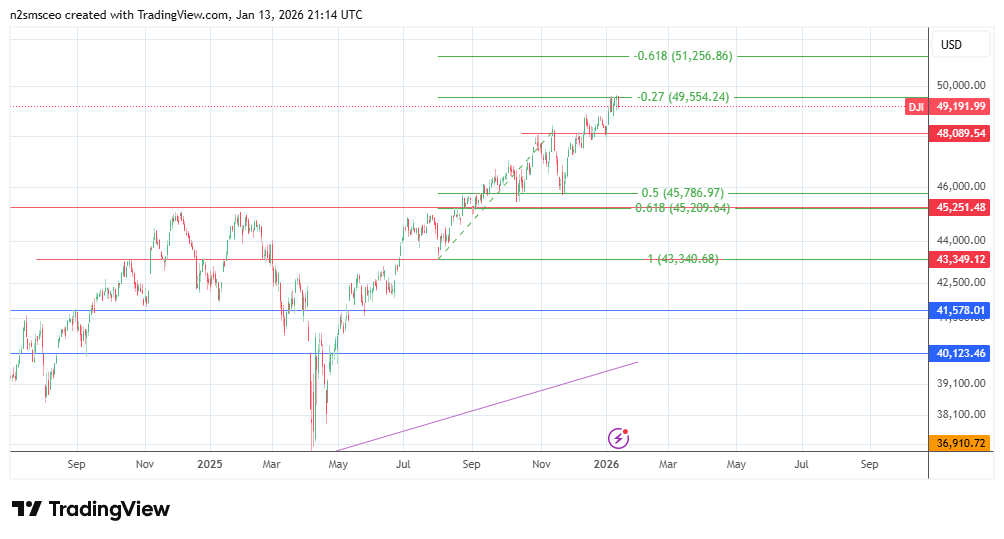 The Dow Jones Index is price-weighted, meaning that individual stocks that trade at high prices can heavily influence day-to-day moves, even in a stable market environment. We see this playing out in January 2026, when VISA and Salesforce suffered down moves that led to a heavy down day on 13 January 2026. The Dow closed 0.8% lower on the day.