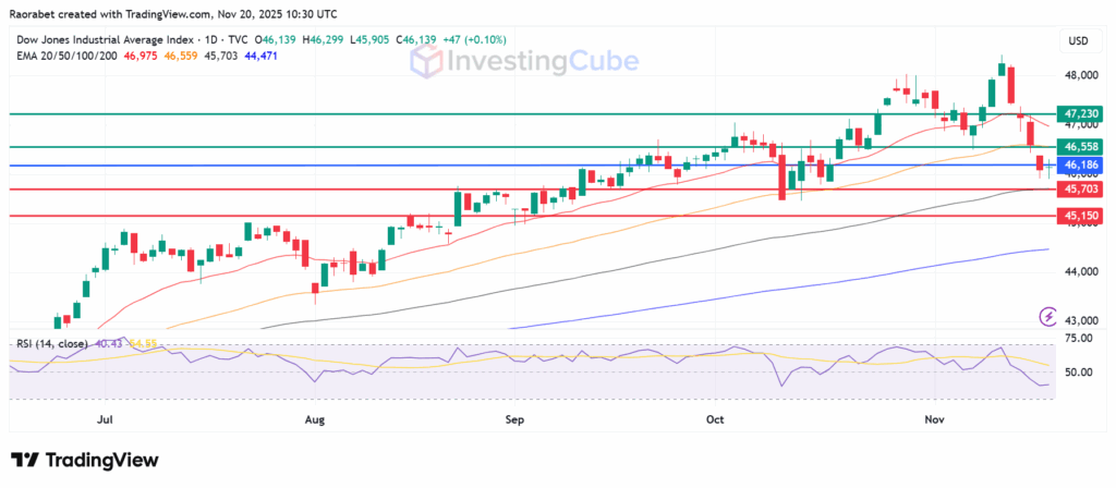 The Dow Jones Index is trading above both its 100-day (45,703) and 200-day (44,471) Exponential Moving Averages (EMA), which signals that the long-term trend is good, even with last week’s dip. According to TradingView charts, the RSI is at 42, which favours the sellers to be in control.