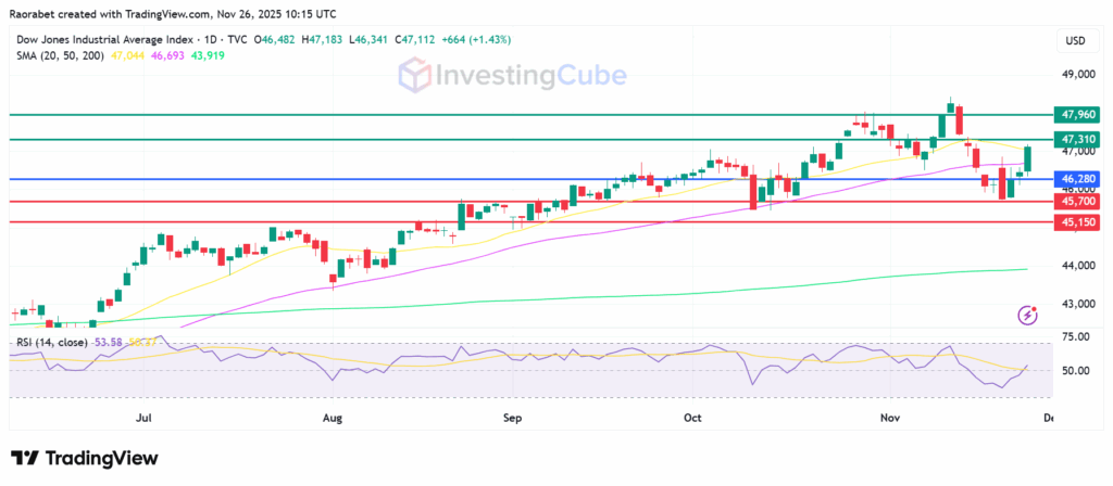 Dow Jones Index on the daily chart as of November 26,2025 with key support and resistance levels. Source: TradingView
