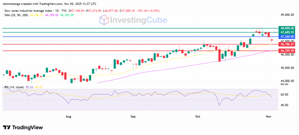 The RSI (14) fell from 65 to 55 in the last three sessions, which is signals a weakening buying momentum. The daily chart for the Dow shows that it has pulled down from its high of 47,940 on October 28 to just above the 50-day SMA around 46,300. If the price drops below that level, it might go to 46,786 points, which is the same as the 20-day SMA.