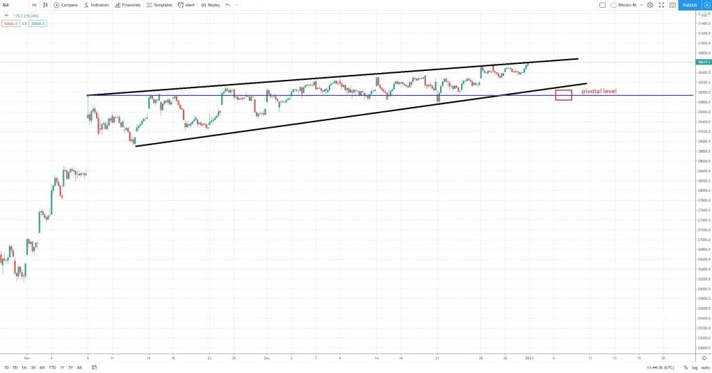 Since the last November U.S. elections, the Dow Jones index jumped aggressively. But from the moment that the index reached the 30,000 level, any advance was just marginal. In fact, technical traders call this pattern a rising wedge, with many trying their hand at shorting the market when the price reaches the upper edge of the pattern.