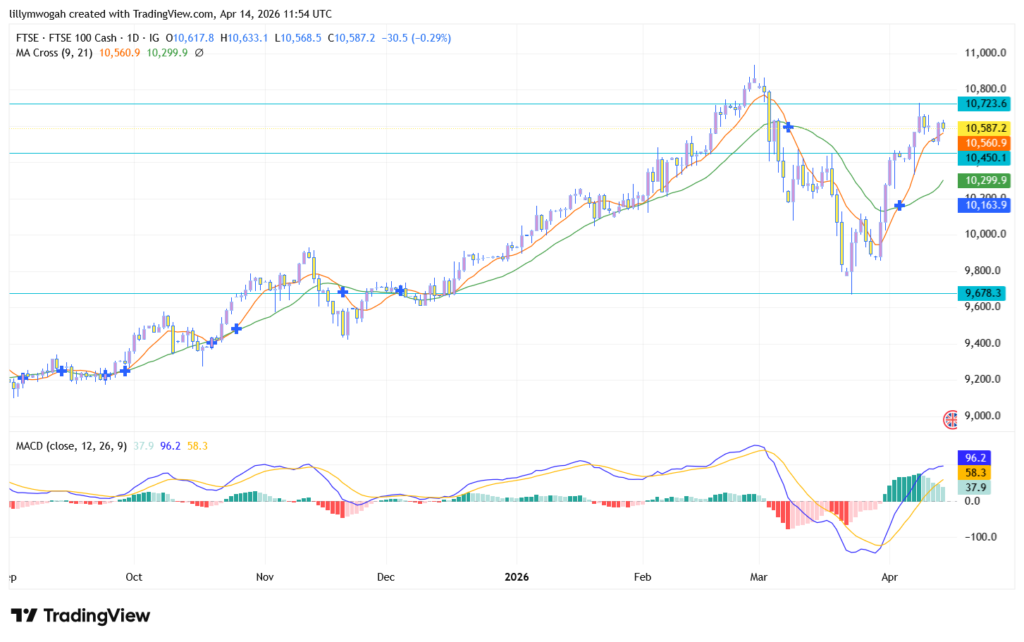 - Market outlook: The index is oscillating near 10,587 as traders recalibrate for a prolonged period of geopolitical uncertainty and supply chain risk. As long as the FTSE holds above 10,560, dips may continue to attract buyers. A break above 10,723 would likely accelerate gains toward the record high at 10,935.
