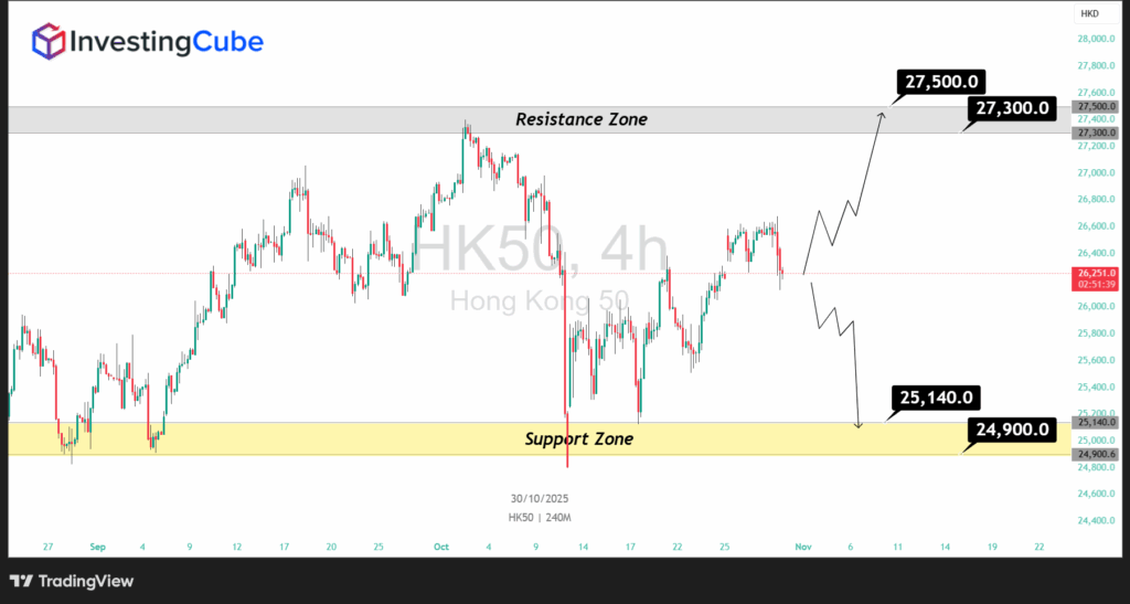 The HSI is expected to trade within a 25,500 to 27,300 band, with a mild upward base. Supportive underlying factors such as policy easing an improving economic data suggest consolidation with a slight bullish bias.