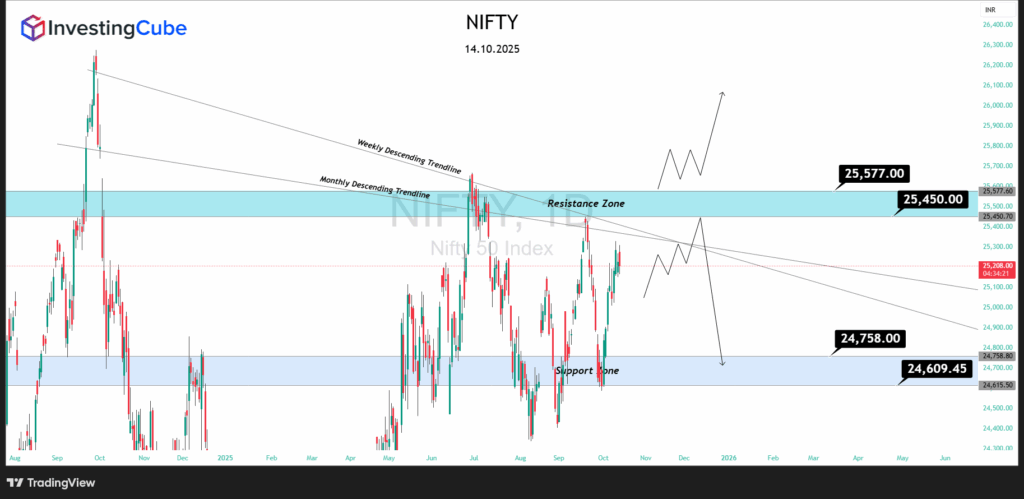 The chart captures the battlefield perfectly. The Nifty is pressing into a resistance belt between 25,450 and 25,580, reinforced by both the weekly and monthly descending trendlines. This is not a level to take lightly: each rally attempt over the past months has stalled in this very zone.