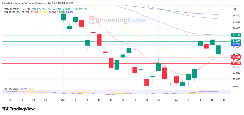 Nifty 50 Index on the daily chart on April 13 showing the key levels of support and resistance. Created on TradingView