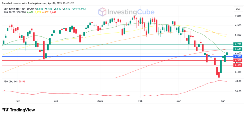 The S&P 500 is near 6,612 on the daily chart. The ADX indicator reading of 38.96 indicates that the upward trend is strong. Resistance levels include the primary one is at the 200-day SMA at 6,648 followed by 6,700. Support sits at 6,528 and the second one is at 6,475.