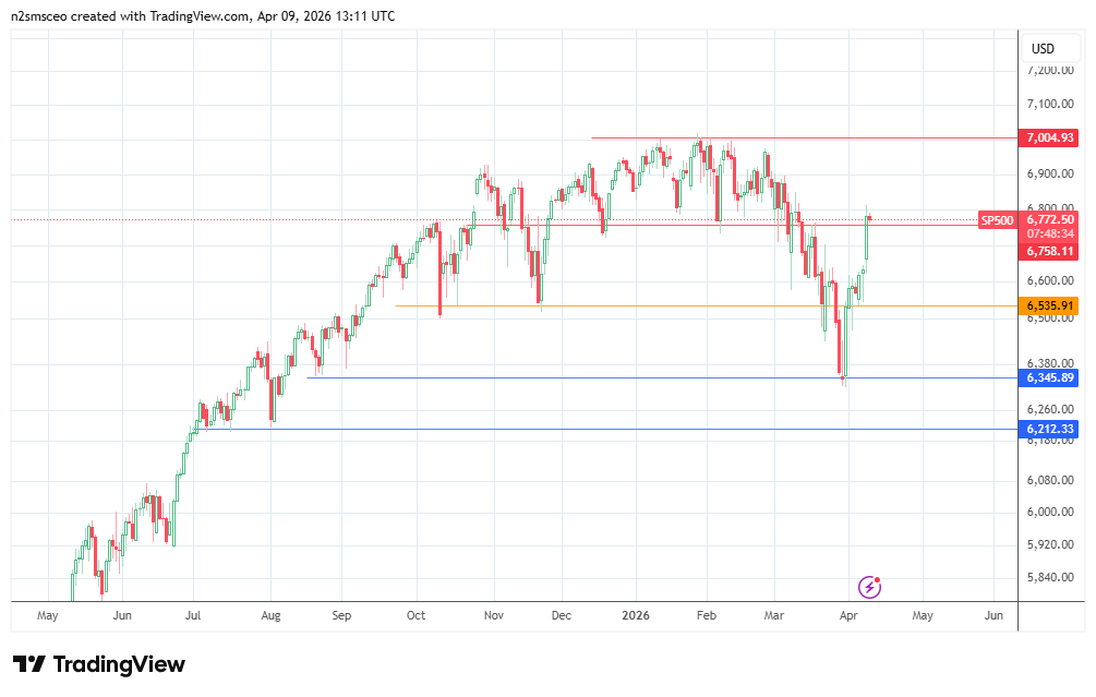 The S&P 500 rallied after the 8 April ceasefire and bond yield drop that followed the reopening of the Strait of Hormuz and oil price decline to $90.40. This is because it brought Fed rate-cut expectations back to the front burner. However, the Fed’s March minutes showed that policymakers are starting to consider rate hikes after raising their 2026 inflation outlook due to the war-related oil shock. So the S&P 500 will continue to respond to Fed policy repricing and the Treasury yields situation.