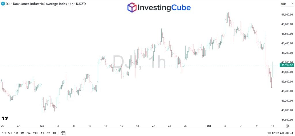 The DJIA is trading near 45,950.57 after bouncing slightly from intraday lows around 45,600. Investor caution is observed following last week’s tariff turbulence.