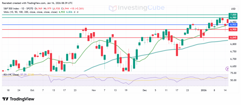 S&P 500 Index daily chart with key support and resistance levels for January 16, 2026. Created on TradingView