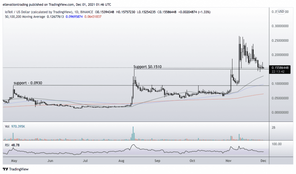 The IoTeX price succumbed to gravity in the second half of November, sliding from $0.265 down to significant support at $0.1500.