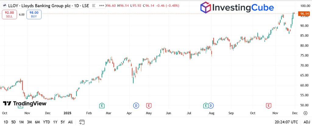 Lloyds Banking Group has extended its impressive comeback through 2025. After spending years stuck in the doldrums, the share price has now climbed to about 96p by the end of November, marking its strongest level since before the pandemic. This represents a jump of more than 70 percent from last year’s lows near 56p. The renewed momentum has firmly returned the bank to investors’ radar as one of the FTSE 100’s standout recovery stories.
