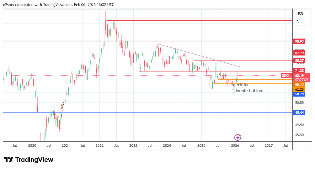 Figure 1: Brent crude weekly chart showing downtrend and base-building at 58.79 (snapshot taken on 6 February 2026)