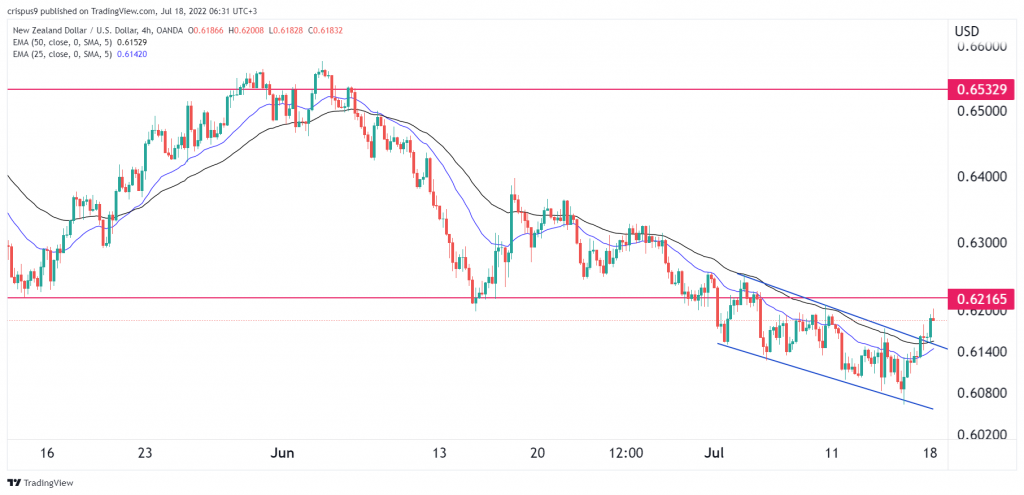 The NZD/USD price popped to the highest point since July 8th as investors reflected the strong New Zealand consumer inflation data. The pair jumped to a high of 62 cents, which was about 2% above the lowest level last week. However, this price is about 5.93%, below the highest point in June.