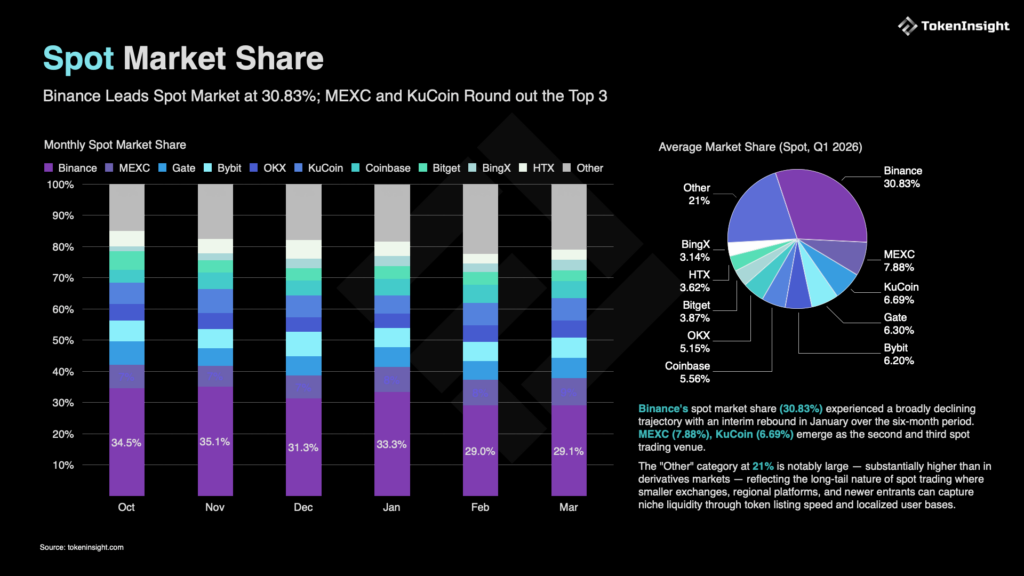 According to the report, KuCoin ranked among the global top three exchanges in spot market share with 6.69% in Q1 2026, underscoring its continued role as a major venue for users seeking broad market access and efficient execution.